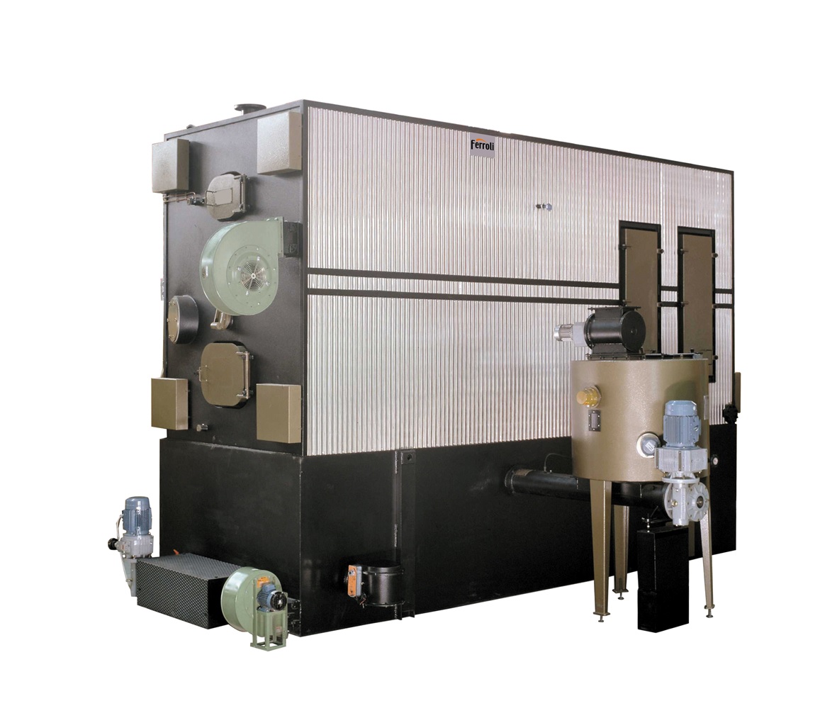 Caldaia FERROLI modello BICOMB SGM 1200 a griglia mobile a intercapedine a tubi d'acqua concepita appositamente per combustibili solidi.